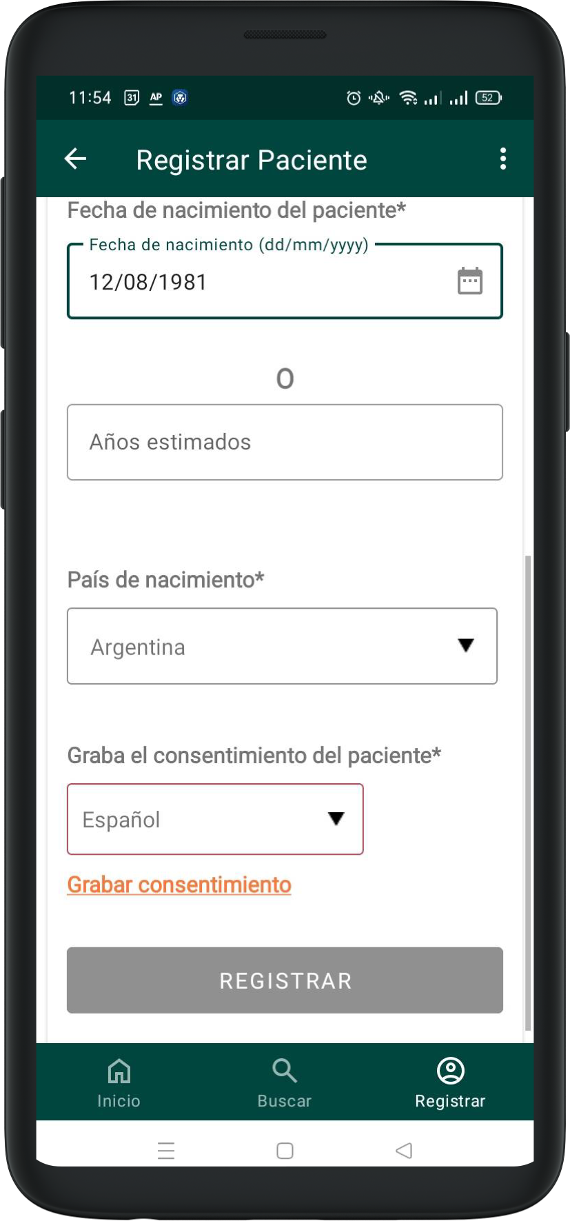 In the Patient creation screen you must enter the patient’s basic information. All inputs are mandatory and marked in red.