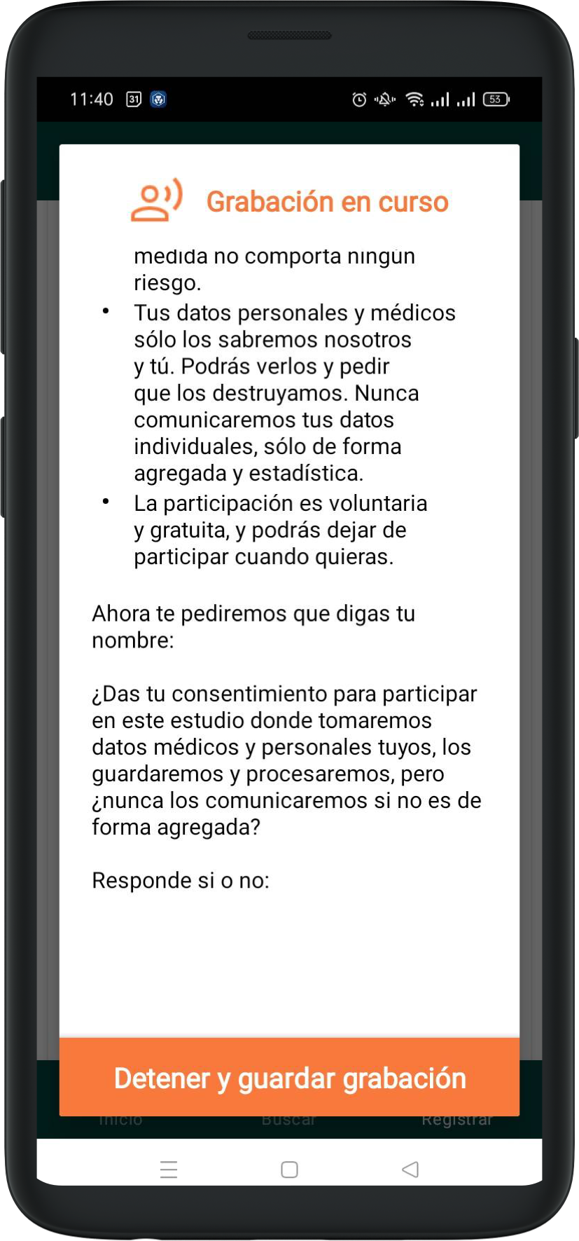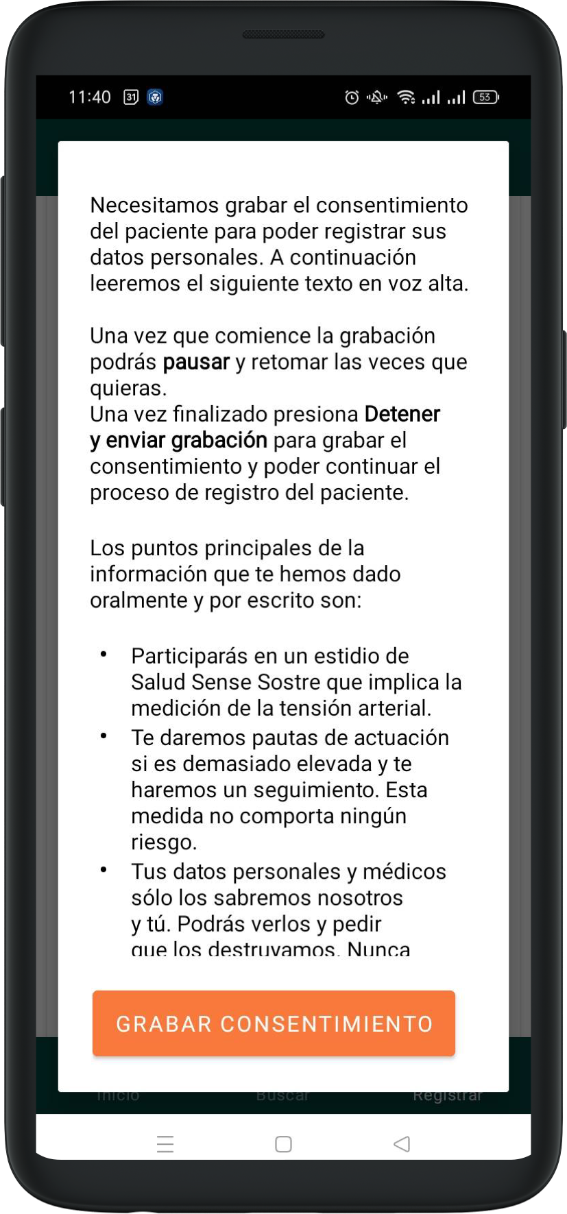 In the Legal Consent Recording section, there are two texts: one in the app language that explains what you can do in this section, and another in the chosen patient languge that explains the legal consent statement, which will be played on speakerphone once you press Record Legal Consent.
