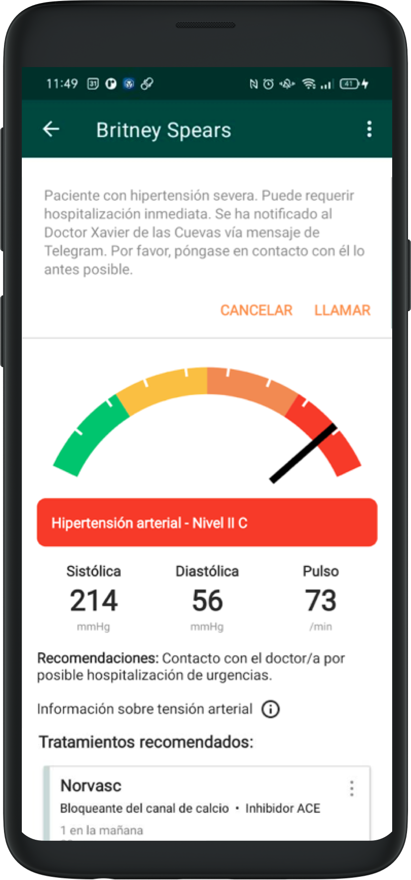 If the patient falls under Arterial tension – Level II C, the Telegram message will be sent and you will also have the option to immediately call the doctor.