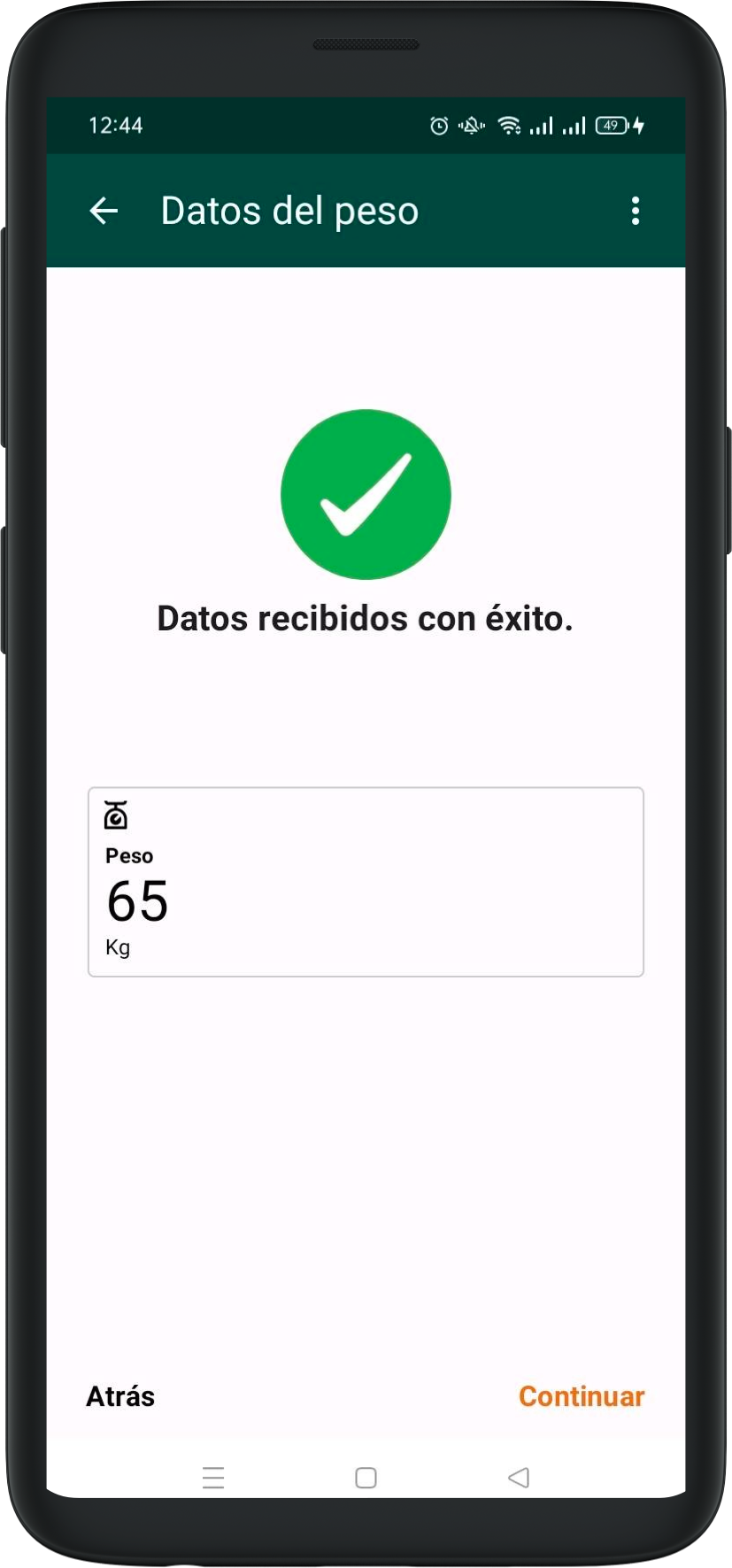 The scale sends data automatically, but be sure to see the symbol. Once the weight has been recorded, the app will show a confirmation screen.
