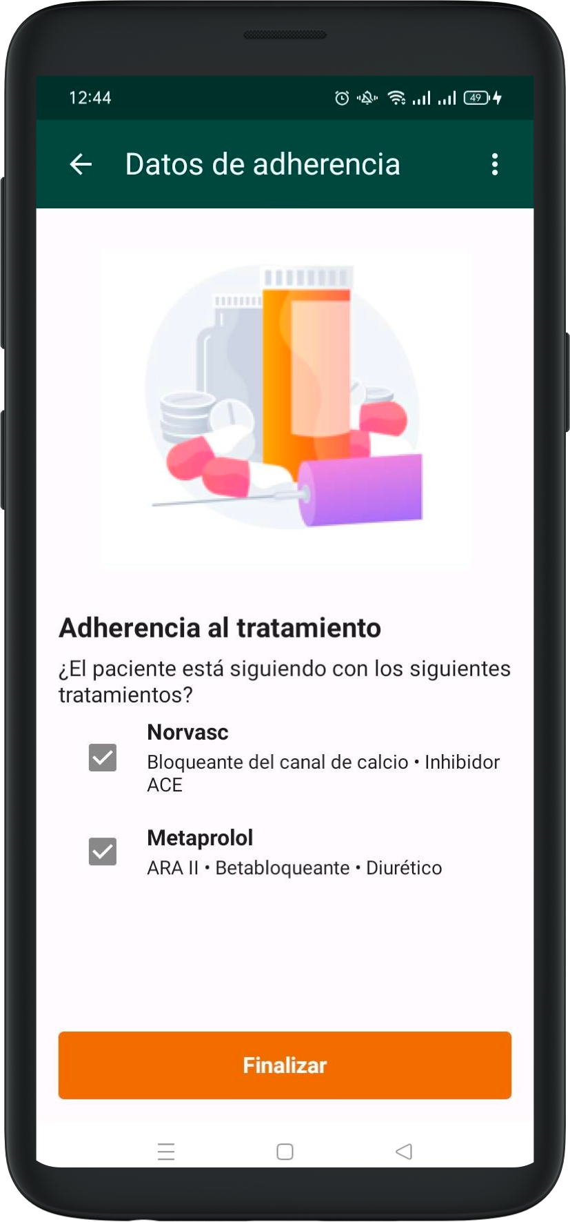 La toma de vitales tendrá una pantalla adicional para documentar la adherencia. Preguntaremos al paciente qué tratamientos sigue tomando y marcaremos las casillas correspondientes en base a su respuesta.